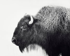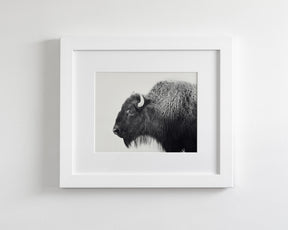 A wild bison profile with a soft gray background. This photograph is simple and classic and can add a understated point of interest in almost any space.