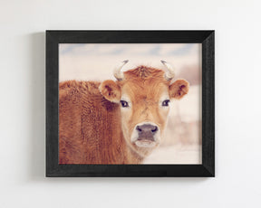 A warm toned image of a cute cow with small horns on a cool winter day.